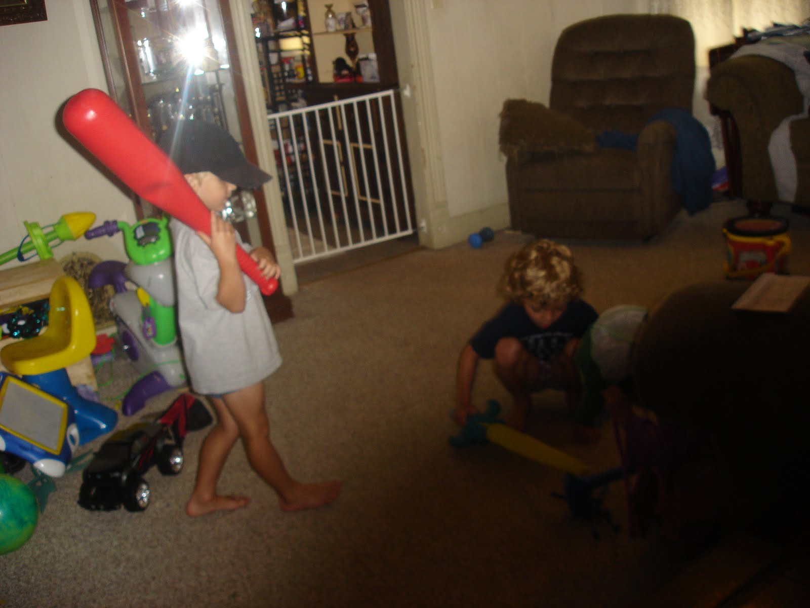 So, once I identified the functions of their behavior, I then had to implement a consequence for each function while making sure the other sibling did not reinforce it. I observed and waited patiently until lo and behold someone got physical. I then stated "no getting physical, no hitting, kicking or biting - time-out". Then I would pick up the perp, plop him in time-out while holding the victim and giving him all of my attention. I didnt speak to or discuss the crime with the perp, though sometimes i had to stand with my back to him and block him from running away from time-out. (time out occurred in a chair placed in the corner of the kitchen away from the tv and other reinforcers) I would set a timer for the age of the perp and then when time-out was over i would hold the two boys next to each other and say "no hitting, kicking, or biting. You can't get physical or you get a consequence". Then we would hug-it-out and be on our way. Now this happened if the aggression came because of attention issues. If aggression happened because the perp wanted access to a toy the victim had, the time-out would still happen and while in time-out the victim would get to keep the toy that was taken from him and after the time-out he would get to keep the toy and I would say the same thing but add a "now you can't have the toy for ______minutes because you got physical." I would then wait the allotted amount of time and when it was his turn I would prompt an appropriate exchange. If the baby took a toy from older brother he would only have to say the name of the toy (ex: car) and then i would have him hold his hand out and older brother had to place it in his hand. He often didn't want to so i would physically prompt older brother to hand it over even if he didnt want to. I would then praise them both.